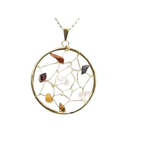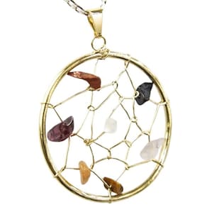 Pingente Filtro Dos Sonhos Pedra Mistas Montagem Presilha banhado Dourado Pedra Ametista Natural de Garimpo Lapidação Rolada e Furada para Passar no Fio Dourado, Pingente Leve e delicado