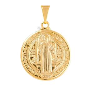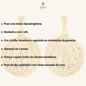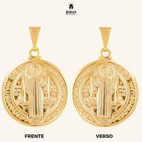 Esta joia excepcional traz a mesma imagem do santo em ambos os lados, criando simetria espiritual.Com detalhes meticulosos e uma aura de proteção, este pingente é uma expressão única de fé e um amuleto pessoal.Esta peça única não é apenas um pingente, mas um elo entre a devoção pessoal e a sofisticação. Ao usá-la, você carrega consigo a presença constante de São Bento e a energia intemporal do ouro 18k, representando sua fé de maneira elegante e duradoura. Características Altura: 2,5 cmLargura: 2,5 cmBanhado a Ouro 18KGarantia:Garantia de 6 meses CDC Art. 26 I contra Defeitos de Fabricação.Para maiores informações consulte nossa pagina com os Termos de Garantia.