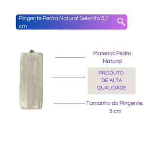 Pingente Pedra Natural Selenita 5,0 cm Pingente Pedra Natural Selenita 5,0 cm O Pingente Pedra Natural Selenita da Bialluz é de alta qualidade feitos de forma artesanal com muito carinho. É perfeito para qualquer pessoa. Cheia de boas energias e carregada de fé nosso pingente emanará muita paz em sua vida Enviamos a seu produto em até 24 horas após a confirmação de pagamento Tamanho: 5,0 cm Material: Pedra Natural Caso tenha alguma dúvida nos mande mensagem que respondemos rapidinho para te ajudar da melhor forma possível Marca: Meta Atacado
