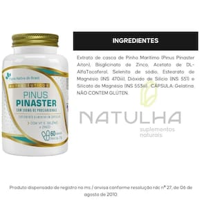 ingredientes extrato de casca de pinho marítimo pinus pinaster aiton , bisglicinato de zinco, acetato de dl-alfatocoferol, selenito de sódio, estearato de magnésio ins 470iii , dióxido de silício ins 551 e silicato de magnésio ins 553iii . Cápsula: gelatina. Não contem glúten. Anvisa: produto indicado para maiores de 19 anos este produto não é um. Não exceder a recomendação diária de consumo indicada na embalagem. Mantenha fora do alcance de crianças. Este produto não deve ser consumido por gestantes, lactantes e crianças. Produto dispensado de registro conforme rdc 240/2018.
