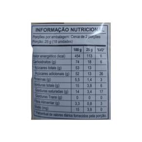 Ingredientes: Pipoca caramelizada (milho* e açúcar) e cobertura sabor chocolate (açúcar, gordura vegetal, cacau em pó, leite integral em pó, emulsificantes: leitina de soja e poliglicerol polirricinoleato e aromatizante). * Espécies doadoras: Bacilus thuringiensis, Streptomyces viridochromogenes, Agrobacterium tumefaciens, Zea mays.