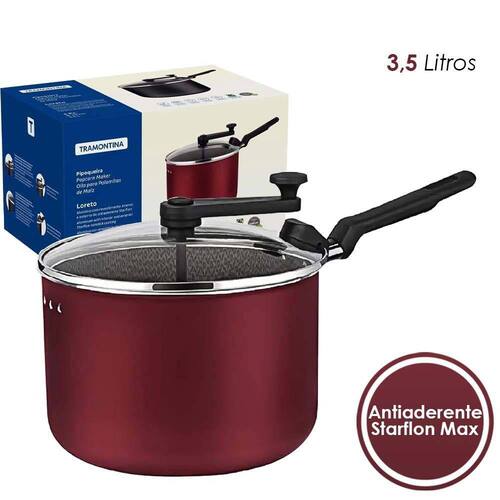 PIPOQUEIRA ALUMINIO 20CM LORETO REVESTIMENTO ANTIADERENTE - TRAMONTINACARACTERÍSTICAS:- A pipoqueira Tramontina Loreto em alumínio com revestimento em antiaderente Starflon Max grafite 20 centímetros de diâmetro 3,5 litros para preparar aquelas pipocas sequinhas e crocantes.- Desenvolvida com corpo em alumínio com espessura de 1,6 milímetros, ela estoura a pipoca de maneira uniforme e rápida- Evitando que grudem na superfície e exigindo menor ou nenhuma adição de óleo, pois conta com revestimento em antiaderente Starflon Max- A pipoqueira tem tampa de vidro temperado que não gira durante o preparo e se encaixa ao cabo, que assim como o manípulo, não aquece e proporciona um manuseio muito mais seguro!ESPECIFICAÇÕES:- Marca: TRAMONTINA- Modelo: 20387720- Peso: 964 gr- Comprimento: 35,4 cm- Largura: 21,2 cm- Altura: 20,4 cm- Garantia: 3 meses