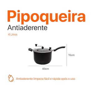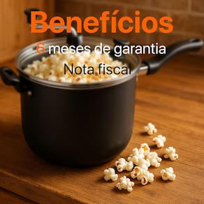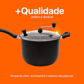 Com capacidade para 4 litros ela é perfeita para grandes porções sua estrutura em alumínio com revestimento antiaderente facilita na hora de mexer e limpar a tampa de vidro com saída de vapor permite acompanhar o preparo sem abrir a panela garantindo mais sabor e segurança Clientes que já compraram destacam como foi fácil preparar pipoca sequinha e deliciosa para toda a família sem bagunça nem esforço