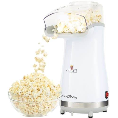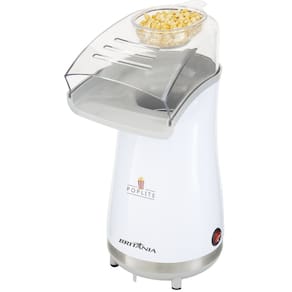 Pipoqueira elétrica Britânia 1000W, prepara pipoca sem óleo, com bocal direcionador, dosador para milho e manteiga, chave liga/desliga e pés antiderrapantes.Luz indicadora de funcionamento