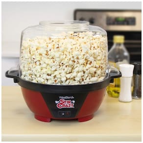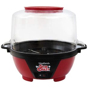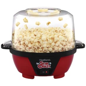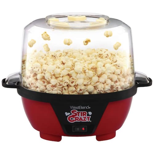 Pipoqueira elétrica West Bend, capacidade de 6 litros, chapa antiaderente, haste de agitação motorizada, tampa transparente ventilada que serve como tigela, cabo com enrolamento para armazenamento.Luz indicadora de funcionamento