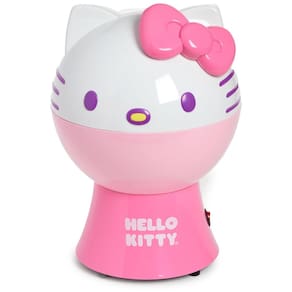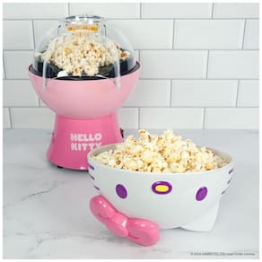Pipoqueira elétrica com tema Hello Kitty, utiliza ar quente, tampa que vira tigela, copo medidor, alta taxa de estouro (98%), e limpeza fácil.Luz indicadora de funcionamento