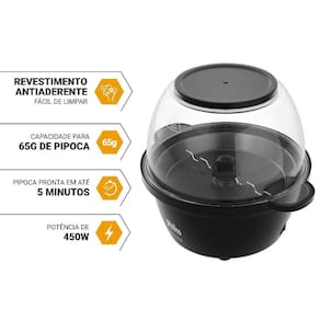 Função 2 em 1: pipoqueira + balde de pipoca Revestimento antiaderente: fácil de limpar Haste de agitação: mistura uniforme sem queimar Acessórios inclusos: dosador de milho (65g) e óleo (15g) Prepara castanhas e coberturas doces Potência de 450W Tempo de preparo: 3 a 5 minutos Pés antiderrapantes e proteção contra superaquecimento Capacidade: até 12 xícaras de pipoca.