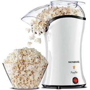 Deixe o cinema em casa ainda mais gostoso com a pipoqueira Popflix PP-04 da Mondial. Sem usar óleo, você garante diversão para família inteira de uma forma mais saudável. Seu bocal direcionador leva toda a pipoca diretamente para a tigela e a colher dosadora facilita a dosagem da quantidade exata do preparo de 100g de milho. Conte com seus 1200W de potência para estourar a pipoca em poucos minutos e com a base antiderrapante para mais estabilidade durante o uso. O guarda fio permite ajustar o comprimento do cabo facilitando na hora de guardar e a sua exclusiva cor branca traz um estilo para a sua cozinha.