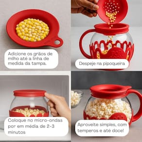Pipoqueira para micro-ondas, sem óleo, design moderno e funcional, prepara pipoca em poucos minutos, material livre de BPA, tampa multifuncional que mede porção de milho.Luz indicadora de funcionamento