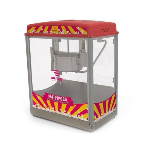 Pipoqueira profissional com estrutura em aço inox e carenagem em polímero termoformado de alta resistência, portas e vitrines em vidro temperado, panela basculante em aço cromado com tampa em inox e parte interna em alumínio, capacidade para 150g de milho de pipoca, produção de até 2,8 kg/h, conjunto misturador estanhado, gaveta de resíduos em aço inox, resistência inferior com potência de 200W blindada e resistência da panela com potência de 1000W blindada, termostato para controle automático da temperatura, lâmpada para iluminação interna.Luz indicadora de funcionamento