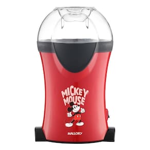 Características Gerais do produto Pipoqueira elétrica Mallory Mickey, prepara pipocas semetros óleo, cometros bocal direcionador, copo metrosedidor para metrosanteiga e pés antiderrapantes. Produto licenciado Disney.