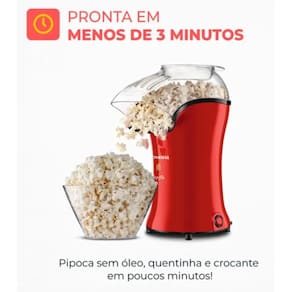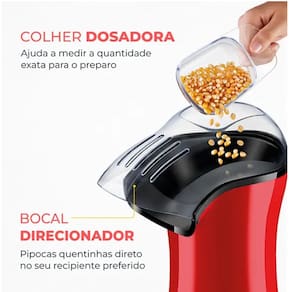 Pipoqueira elétrica Mondial Red, 1200W, prepara pipoca em menos de 3 minutos por meio de circulação de ar quente, sem necessidade de óleo. Possui bocal direcionador, tampa dosadora e sistema de proteção contra superaquecimento.Luz indicadora de funcionamento