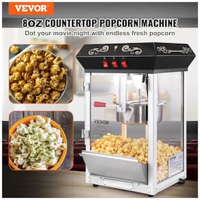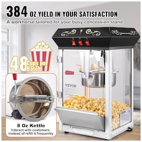 Pipoqueira VEVOR 850W com capacidade para 48 copos, design de cinema, vidro temperado, sistema de mexedura integrado e estrutura resistente em aço. Inclui 4 conchas.Luz indicadora de funcionamento