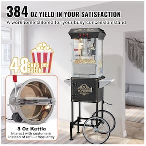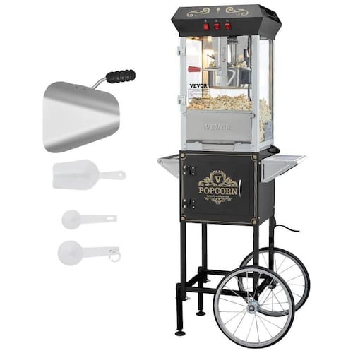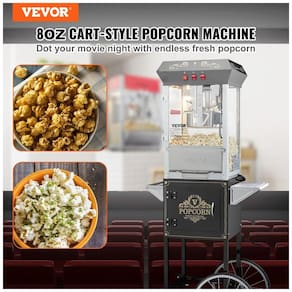 Pipoqueira VEVOR com carrinho, capacidade para 48 copos, potência de 850W, estrutura em aço laminado e vidro temperado, sistema de agitação incorporado e plataforma de aquecimento.Luz indicadora de funcionamento