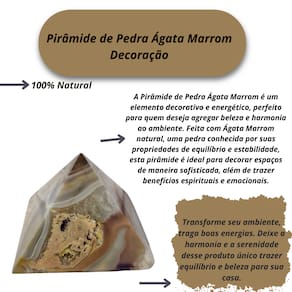 Decoração Sofisticada: Além de suas propriedades espirituais, a pirâmide de Ágata Marrom é uma peça decorativa elegante e atemporal, que combina com diversos estilos de interiores, desde os mais modernos até os mais tradicionais.