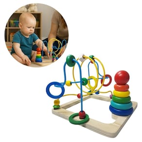 Além do labirinto de arames, o brinquedo também possui uma torre de montagem com peças de madeira que variam do maior para o menor tamanho. A criança é incentivada a empilhar corretamente, o que fortalece o controle das mãos e o entendimento sobre ordem e proporção. Esse tipo de atividade favorece o desenvolvimento da coordenação motora fina, essencial para tarefas como desenhar, recortar e escrever no futuro.