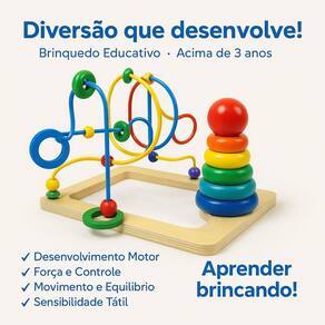 Além do labirinto de arames, o brinquedo também possui uma torre de montagem com peças de madeira que variam do maior para o menor tamanho. A criança é incentivada a empilhar corretamente, o que fortalece o controle das mãos e o entendimento sobre ordem e proporção. Esse tipo de atividade favorece o desenvolvimento da coordenação motora fina, essencial para tarefas como desenhar, recortar e escrever no futuro.