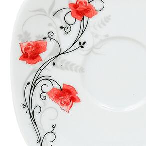É produzido em porcelana de altíssima qualidade na cor bege branco com floral vermelho, que traz uma sensação de leveza a sua mesa.