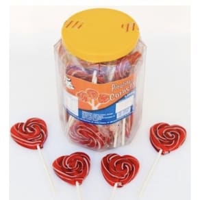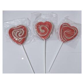 Pirulito psicodélico vermelho e branco em formato de coração com 35 gramas cada. Contém 30 unidades. Peso líquido 1,05 kilogramas.