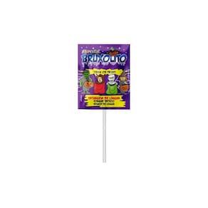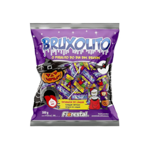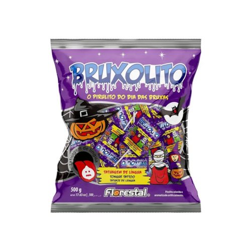 Pirulito plano Bruxolito com tatuagem de lígua no tema do Dia das Bruxas com 10 gramas cada. Pacote contedo aproximadamente 50 unidades. Peso líquido total 500 gramas.