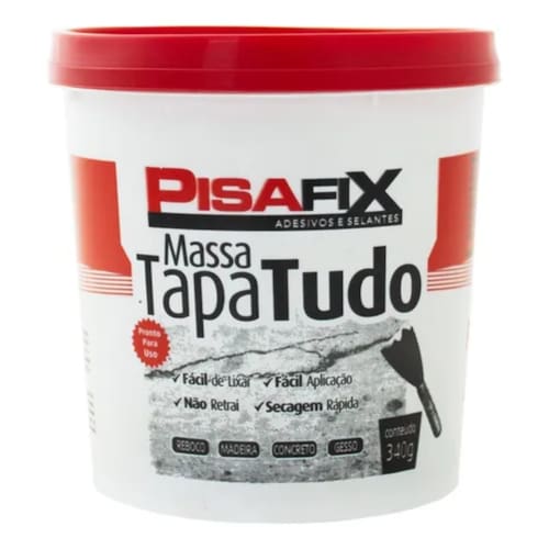 A Massa Tapa Tudo Pisafix, é um produto ultraleve de fácil aplicação e secagem rápida. É utilizado para corrigir pequenas imperfeições (fissuras, espaços deixados por pregos e parafusos, e também fendas de nó de madeira), sem rachaduras e retração. Indicado para ambientes externos e internos, para qualquer tipo de acabamentos, base água e base solvente.