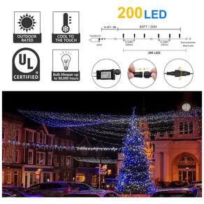 Luzes de Natal ao ar livre: luzes de cordas LED em azul e branco de baixa tensão de 29V. As luzes de cordas externas de 20,12 metros com 200 LEDs permitem um grande espaço de decoração. As decorações de Natal podem trazer às pessoas um ambiente mais caloroso e feliz durante os dias de folga.