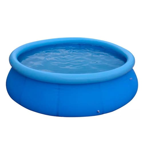 Sua estrutura é feita com lona reforçada com laminado duplo e uma trama de poliéster entre as lâminas que dão maior resistência ao produto. Para montagem da piscina, basta estender a lona no chão, inflar a borda e encher de água até a altura indicada no manual.