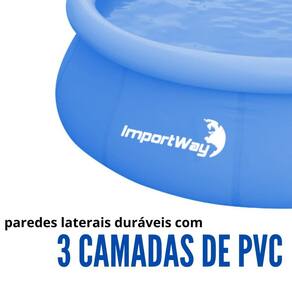 Fácil de montar, a piscina inflável da Importway é a melhor opção para se refrescar com a família e com os amigos nos finais de semana. possui 3 camadas de pvc laminado de alta resistência que oferece uma excelente durabilidade além de possuir um válvula de dranagem e encaixe para utilização de filtro.