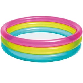 A piscina infantil Arco Iris possui um design tricolor, com 3 anéis transparentes nas cores rosa, amarelo e azul, para o seu bebê desfrutar de um banho exclusivo e refrescante em total segurança enquanto brinca na água.