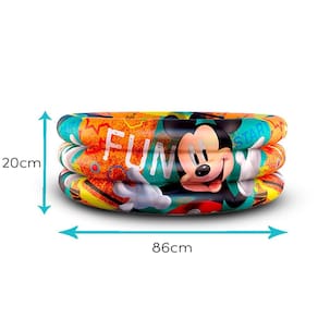 Design colorido com imagens do Mickey Mouse. Material resistente e seguro para crianças. Fácil de inflar e desinflar, armazenamento prático. Inclui 50 bolinhas coloridas para uma brincadeira extra