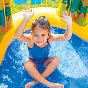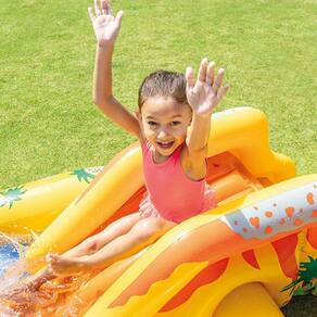 A Intex acaba de fabricar uma piscina infantil com temática e formato de dinossauro para deixar a brincadeira de verão ainda mais divertida. Além de se divertir na piscina na boca do dinossauro a criança brinca de atirar as seis bolinha, fabricada em PVC e coberta de tinta atóxica.