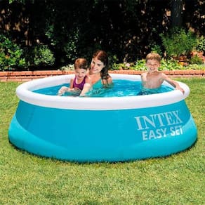 As piscinas desmontáveis Intex são de fácil instalação: estender sobre terreno firme e nivelado, insuflar o anel superior e encher com água