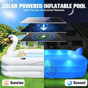 - Piscina inflável de cisne solar atualizada em 2025: o fascínio da piscina solar de cisnes vem dela equipada com painéis solares de ponta, aproveita totalmente a luz solar de um dia, carregando até 14 contas de luz LED brilhantes e brilha encantadoramente durante toda a noite após o anoitecer. É mais brilhante e duradouro do que outras piscinas infláveis no mercado. Quem não gostaria de nadar enquanto economiza nas contas de energia? Ao pôr do sol, sua superfície branca se torna uma tela LED colorida. Personalize o brilho para qualquer humor. Você decide