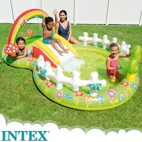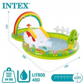 Crie um centro de entretenimento para seus filhos em seu próprio jardim! A piscina do jardim é um playground ideal nos dias de verão. É feito de material de vinil forte e durável (PVC). Ele tem um pulverizador embutido - basta ligar a mangueira do jardim (não inclusa), e a partir do arco-íris vai começar a jorrar água. O escorregador é finalizado com um tapete de pouso para maior conforto É equipado com uma rolha de drenagem para esvaziar a piscina de forma fácil e rápida. Dois cogumelos, quatro borboletas e três bolas foram adicionados ao parque aquático. Há também um adesivo de reparo incluído para reparar qualquer dano menor. Características: Espessura do vinil: 0,30 mm. Dimensões: 290 cm x 180 cm x 104 cm. Peso caixa: 6,1 KG. Capacidade: 450L. Nível máximo de água: 13 cm. Suporta até 81 KG.