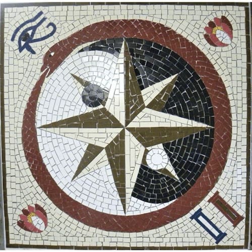 O piso Maçônico é rico em simbolismo de várias culturas incorporadas ao longo da história da Maçonaria. Ele apresenta símbolos egípcios, hebraicos e renascentistas. O destaque principal é a rosa dos ventos, símbolo antigo que representa orientação espiritual, domínio do espaço e conhecimento. Ela está acompanhada pelo Yin e Yang oriental, que promove equilíbrio e a compreensão de que nenhum polo é completamente puro. O Ouroboros grego, cercando a estrutura, simboliza o ciclo eterno de evolução. Duas flores de lótus nos cantos representam a luz espiritual inerente a cada indivíduo, semelhante à planta que emerge pura do lodo do rio Nilo. O olho de Ísis oferece proteção e cuidado universal. Por fim, as colunas Jaquim e Boaz, típicas da Maçonaria, simbolizam força e sabedoria, lembrando a importância de buscar o aumento do conhecimento e da força espiritual para prosperar.