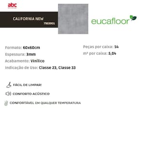 O Piso Vinílico Efloor Working+ California New 60x60cm oferece resistência, praticidade e um visual moderno inspirado no estilo cimento. Ideal para ambientes residenciais e comerciais, garante conforto acústico, durabilidade e fácil manutenção, unindo elegância e funcionalidade em um único produto.