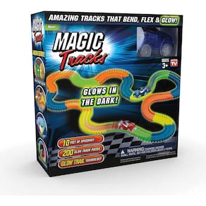 PRODUTO INTERNACIONAL. Apresentamos a incrível pista de corrida Magic Tracks, flexível, dobrável e brilhante! Com a tecnologia Serpentina, você pode criar qualquer design de pista que desejar. Em segundos, suas pistas personalizadas estão prontas para ação! A luz neon em toda a pista oferece ótima visibilidade mesmo no escuro