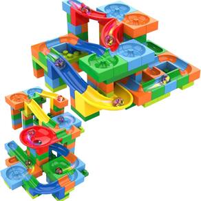 A pista possui 128 peças e já acompanha 5 bolinhas de gude. Manual com instruções de montagem na caixa.