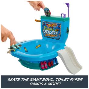 Prepare-se para as manobras mais radicais com o Hot Wheels Skate Flush & Go Skate Bowl! Este conjunto único em formato de vaso sanitário oferece uma variedade de superfícies para andar de skate, incluindo um vaso sanitário gigante e curvo, 2 rampas de papel higiênico, um trilho de moagem e uma rampa na parte de trás, proporcionando diversão sem fim.