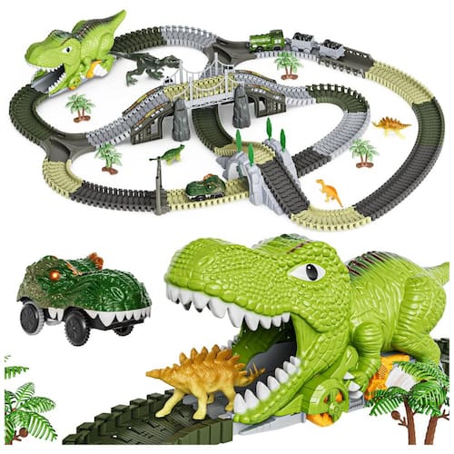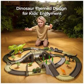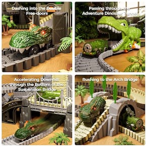 O Conjunto de Trilhos de Trem de Dinossauro TUMAMA é um brinquedo de pista que inclui 281 peças, como 240 peças de trilhas flexíveis, 2 carros operados por bateria, 1 carro dinossauro, 1 carro de brinquedo locomotiva, 2 carros de minas, 4 figuras de dinossauros, 1 túnel de dinossauro, 1 ponte, 1 rampa, 1 porta, 1 garfo em forma de Y, 2 macacos e 8 árvores. O design avançado permite que as crianças criem seu próprio reino de dinossauros e experimentem livremente o jogo de corrida de carros de dinossauros. Os dois carros operados por bateria possuem luzes piscantes que são acionadas automaticamente em azul e vermelho enquanto estão em movimento. O túnel de dinossauro destacável pode ser utilizado para conectar a pista ou ser transformado em um carro de brinquedo de dinossauro para as crianças se divertirem. Este conjunto é adequado para crianças de 3 a 7 anos e é um presente perfeito para meninos e meninas.