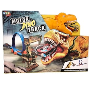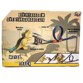 Super Pista de Corrida Mega Dinossauro, uma pista com dois looping radicais que vai direto a boca do terrível Dino com as presas afiadas. E ainda tem uma super plataforma de lançamento dando ainda mais velocidade no carrinho para vencer o Dino. é super fácil e prático de montar.