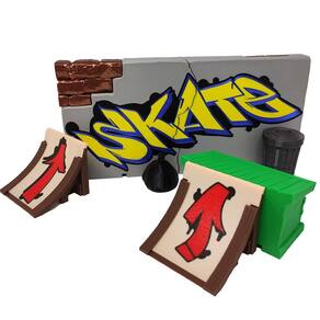 A Pista de Skate de Dedo 3D Muro Graffiti Wall traz uma experiência autêntica para os fãs de fingerboard, com acessórios inclusos como um muro, uma lixeira, um saco de lixo e uma lixeira pequena.