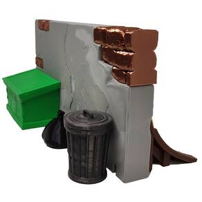 Acessórios incluídos: muro, uma lixeira, um saco de lixo e uma lixeira pequena.