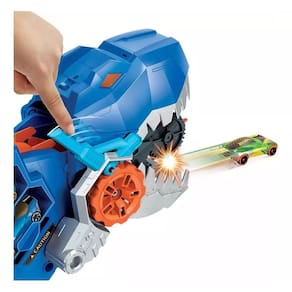 Este incrivel caminhão de mais de 65 em se move para frente e para trás enquanto devora os veículos que encontra pelo caminho. Este reboque se transforma facilmente em um grande Tiranossauro Rex com uma pista de corrida nas costas. Pode armazenar mais de 20 carros 1:64. Este item tem luzes e sons e inclui 2 veículos die-cast 1:64.
