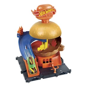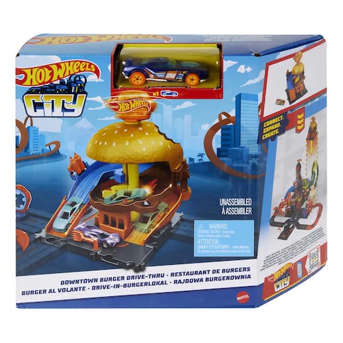 Detalhes do Produto Depois de lutar contra criaturas ferozes, faça uma pausa e coma alguma comida no Hot Wheels™ City Downtown Burger Drive-Thru. Vire o sinal e mova automaticamente o carro pelo restaurante – mas cuidado! Há evidências de que as criaturas também fizeram um pitstop! Mova o desviador de ketchup e cruze a grelha antes de acelerar para outras aventuras. Este conjunto se conecta a outros conjuntos e pistas Hot Wheels® através de vários pontos de conexão para que as crianças possam criar uma paisagem urbana épica de seu próprio design. Um veículo Hot Wheels® está incluído para brincar direto da caixa. Cada conjunto vendido separadamente, sujeito a disponibilidade. Cores e decorações podem variar.Ao lutar contra as criaturas de Hot Wheels™ City, entre no Hot Wheels™ City Downtown Burger Drive-Thru para comer em movimento. Mas cuidado com os inimigos perigosos que deram uma mordida no hambúrguer!As crianças giram o sinal do logotipo e os carros rolam automaticamente pelo drive-thru, onde detalhes legais aprimoram a brincadeira e a diversão. Confira o cardápio e o portão móvel em formato de espátula.O conjunto inclui 1 carrinho de brinquedo Hot Wheels para brincar e se divertir imediatamente.Conecte o Hot Wheels™ City Downtown Burger Drive-Thru a outros conjuntos Hot Wheels® para construir um mundo único de diversão e aventura, com recursos interessantes que aprimoram o jogo e aumentam a diversão! Cada um vendido separadamente.