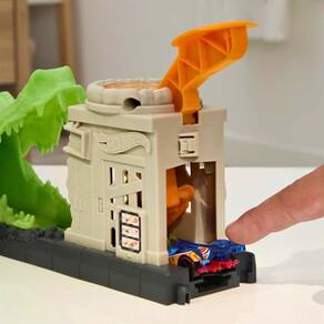 No conjunto Hot Wheels Looping de Ataque do Crocodilo, um crocodilo invadiu a pizzaria Hot Wheels para devorar carros, a menos que as crianças possam detê-lo com suas manobras incríveis. Reposicione a cauda gigante do crocodilo para criar um loop ou hélice para uma brincadeira versátil na pista. Quando as crianças lançam seus carros, elas podem derrubar o crocodilo e correr em direção a novas aventuras. Inclui um carro Hot Wheels que pode ser conectado a outros conjuntos