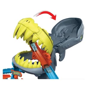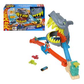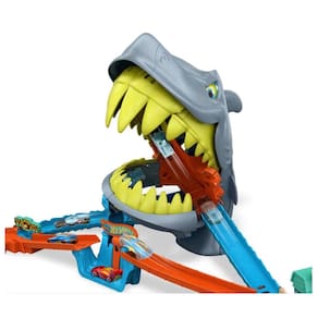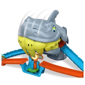 As crianças e seus carrinhos Hot Wheels enfrentam um tubarão faminto no Playset Praia Mordida de Tubarão da Hot Wheels City. Ajuste o lançador giratório para escolher um dos dois caminhos: saltar sobre um vão para evitar o tubarão ou mirar diretamente nele com uma manobra em forma de oito. O truque é lançar os carrinhos com força suficiente para escapar ilesos e nocautear o tubarão. Com uma simples reinicialização, as crianças podem repetir o desafio.