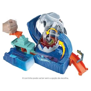 A Hot Wheels City está sendo atacada por um enorme tubarão robótico! As crianças vão querer descobrir se são rápidas o suficiente para atravessar a onda sem serem comidas! As crianças começam sua jornada heróica mergulhando o carro na primeira câmara de água fria, depois levantam a alavanca para carregar o carro no lançador e se preparam para correr pela onda. A boca do tubarão se abre e, se o golpe falhar, as crianças caem na barriga dele! Uh-oh, almoço de tubarão. Quando na barriga do gigante Tuburão Robô, o carro muda da cor magicamente! Redefina o tubarão fechando a boca e tente novamente. As crianças podem carregar no lançador e aumentar o máximo possível para obter velocidade suficiente para escapar das mandíbulas do tubarão, atravessá-lo e garantir a segurança do calçadão. Conecta-se a outros conjuntos Hot Wheels vendidos separadamente para infinitas possibilidades.
