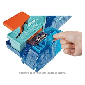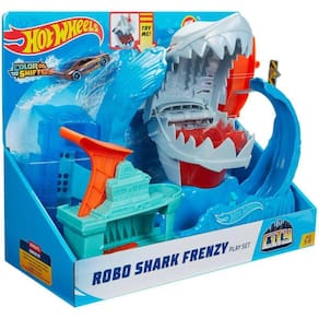 A Hot Wheels City está sendo atacada por um enorme tubarão robótico! As crianças vão querer descobrir se são rápidas o suficiente para atravessar a onda sem serem comidas! As crianças começam sua jornada heróica mergulhando o carro na primeira câmara de água fria, depois levantam a alavanca para carregar o carro no lançador e se preparam para correr pela onda. A boca do tubarão se abre e, se o golpe falhar, as crianças caem na barriga dele! Uh-oh, almoço de tubarão. Quando na barriga do gigante Tuburão Robô, o carro muda da cor magicamente! Redefina o tubarão fechando a boca e tente novamente. As crianças podem carregar no lançador e aumentar o máximo possível para obter velocidade suficiente para escapar das mandíbulas do tubarão, atravessá-lo e garantir a segurança do calçadão. Conecta-se a outros conjuntos Hot Wheels vendidos separadamente para infinitas possibilidades.