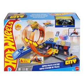 Há quatro maneiras diferentes de correr e fazer acrobacias no conjunto Hot Wheels City Super Delegacia de Polícia com sua pista ajustável! Você pode dirigir o carro de polícia de brinquedo fundido em escala 1:64 incluído no lançador, onde há uma mangueira flexível para reabastecer antes de entrar em ação. Você pode deslizar a pista em loop para um dos quatro caminhos - cada um mostra uma acrobacia ou um resultado diferente. Estacionar até quatro veículos no conjunto e conectar outras pistas e conjuntos permite uma brincadeira sem limites. Um carro está incluído; veículos e pistas adicionais são vendidos separadamente. As cores e as decorações podem variar.Inclui 1 Hot Wheels City Super Delegacia de Polícia com carro de polícia em escala 1:64.